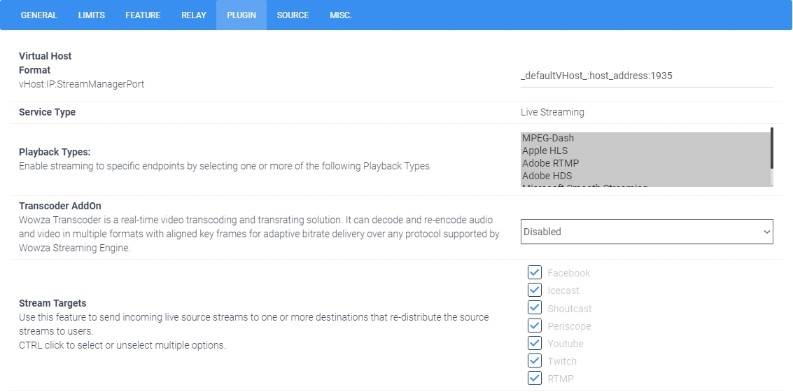 1. Enable Youtube Stream Target under the Feature (for Flussonic) or Plugin (for Wowza) configuration tab.